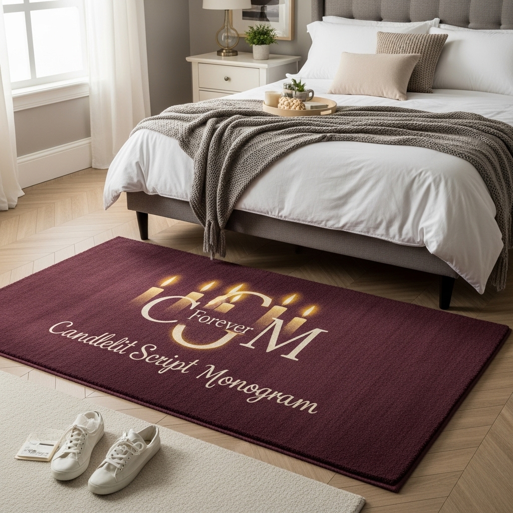 Candlelit Script Monogram turns the bedroom into something quietly romantic. A personalized script monogram glows in soft, faux candlelit beige against a deep burgundy base, plush yet supportive underfoot. Mid-pile fibers invite comfort, while a wool-synthetic blend ensures lasting durability.