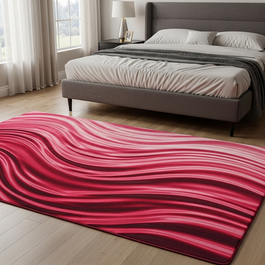 Flowing crimson waves in a silk-blend rug mimic ocean tides of passion, with glossy fibers that shimmer invitingly. Low-profile design suits low beds, providing just enough underfoot luxury without bulk.