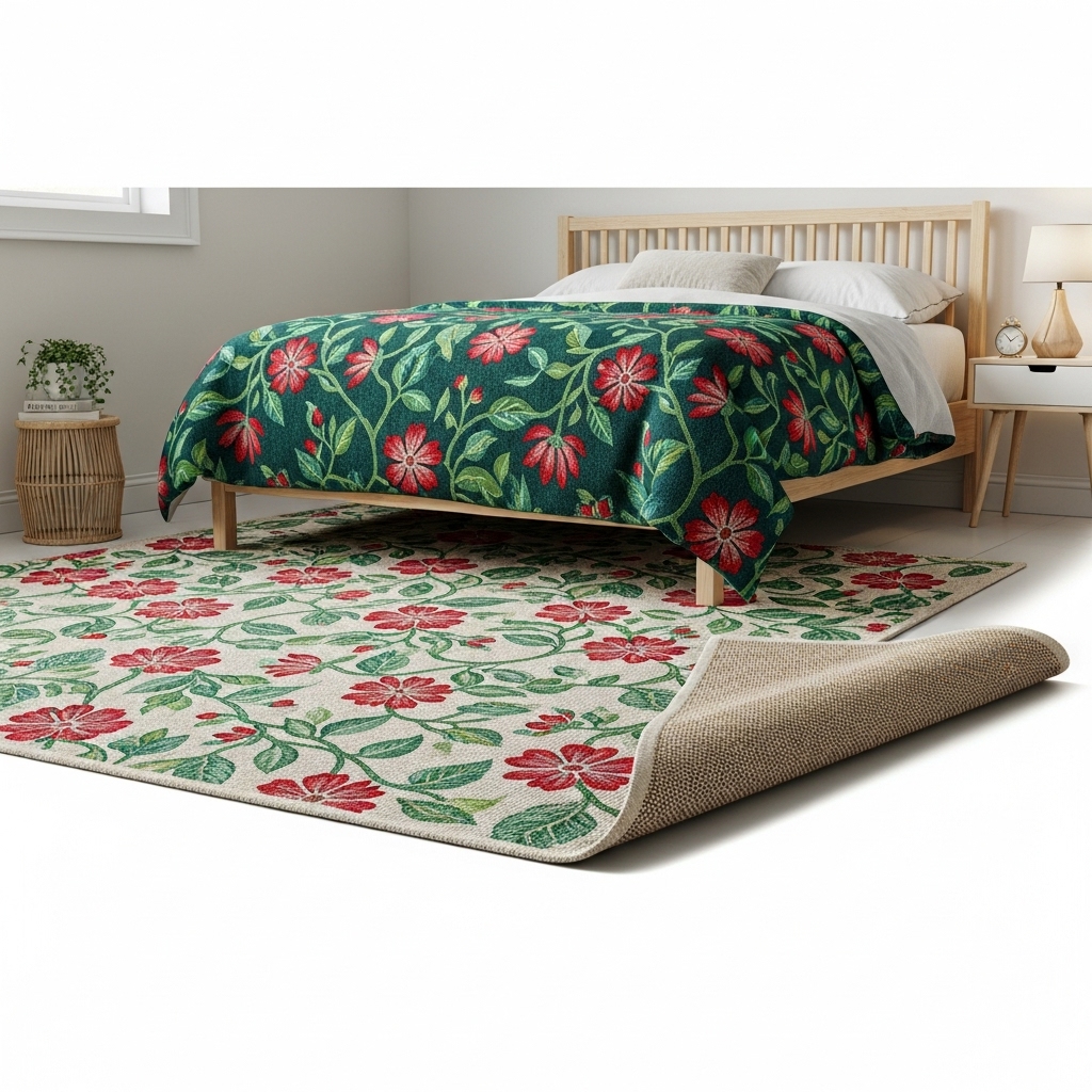 A natural jute backing keeps the rug breathable, ideal for humid evenings and resistant to mold. Wrapped around the bed, it feels organic and intimate, blending untamed passion with quiet, restorative calm while soft textures anchor modern rooms with botanical drama.