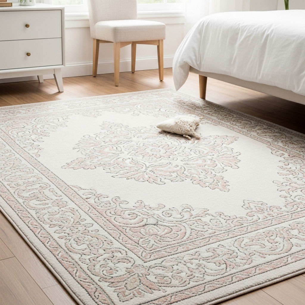 Intricate floral motifs add depth, drawing the eye to create a cozy focal point under the bed. Soft edges blend with hardwood surrounds, enhancing airflow while trapping warmth for chilly evenings.