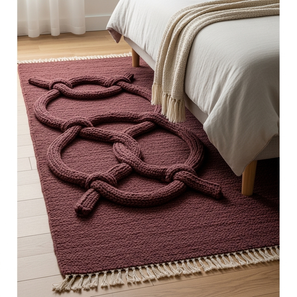 Hand-tufted love knots in pure wool weave a quiet narrative of connection, rendered in deep, softened maroon. The sculpted high–low pile creates visual rhythm while holding comforting warmth through colder months.