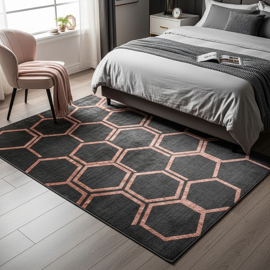 Modern hexagons stitched in luminous rose gold metallic thread shimmer against a deep charcoal gray base, striking a balance between sleek modernity and soft romance. The low-pile synthetic construction resists fading, even in sun-filled bedrooms.