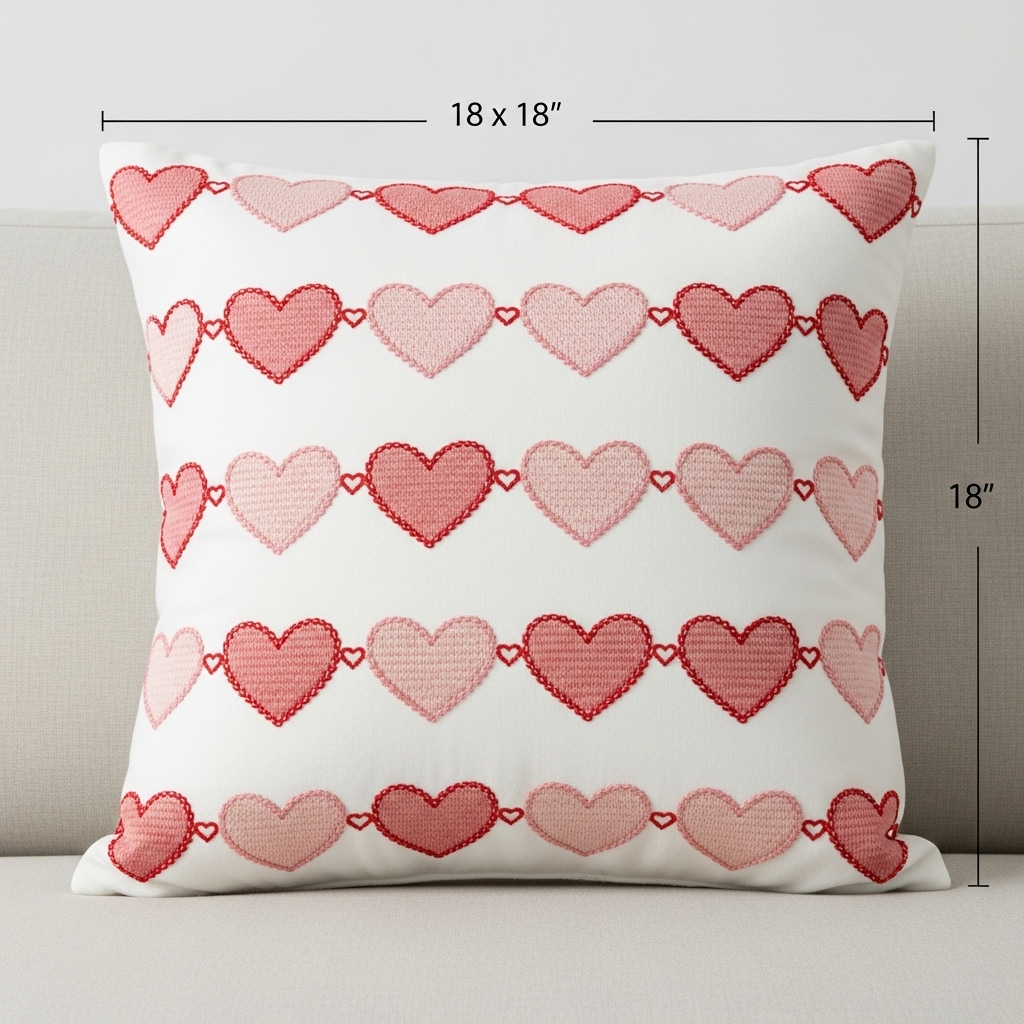 Across a crisp square pillow, a neat procession of embroidered hearts creates a refined, romantic rhythm. Scarlet or blush stitching against a white backdrop feels fresh, not fussy. A soft polyester fill keeps the cushion plush and inviting, sized at a sofa-friendly 18 by 18 inches.