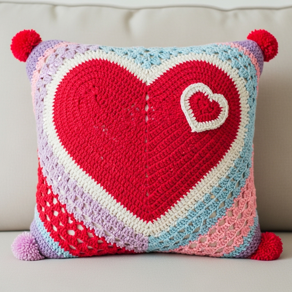 Alternate colors row-by-row for whimsy or add pompoms for extra flair. Ideal for craft lovers, its breathable yarn provides soft comfort on couches. Dimensions typically fit 16-18 inches square, perfect for layering. Pair it with neutrals to let the bold heart shine, creating a focal point that whispers romance.