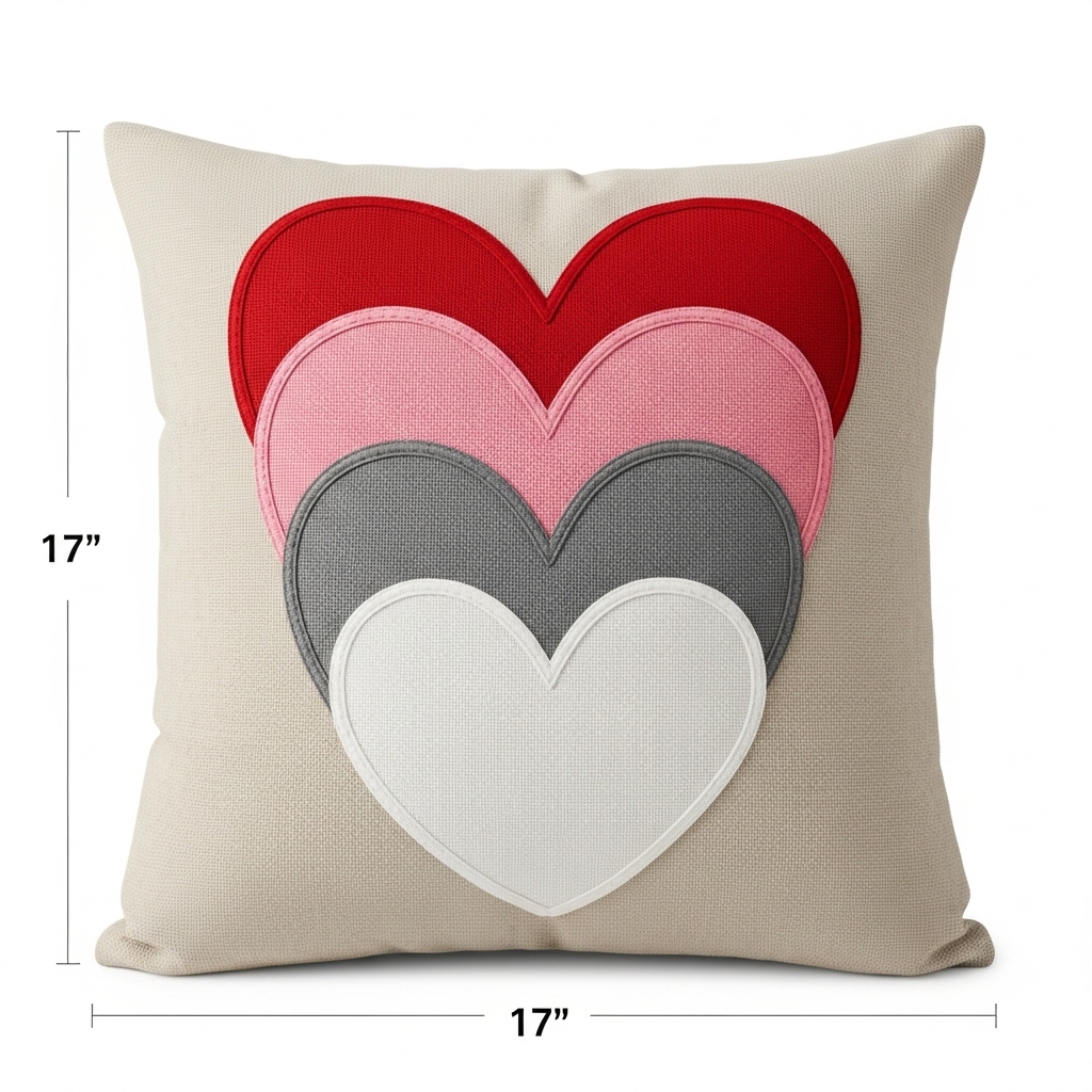 Layered, heartfelt motifs take center stage in this striking accent pillow. Four bold heart shapes red, pink, gray, and white are stacked with intention, combining appliqué and embroidery to create rich depth and texture.