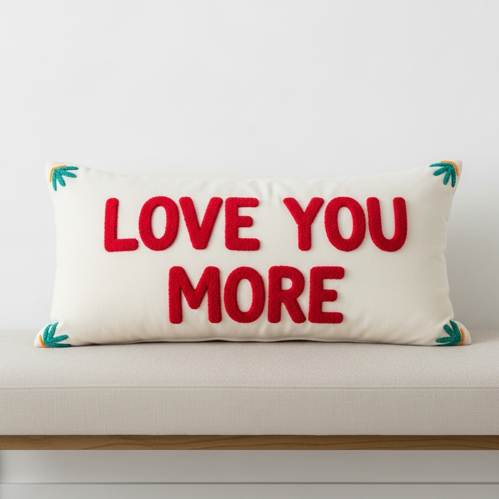 The “Love You More” rectangular pillow delivers bold emotion with effortless charm. Crisp red appliqué lettering pops against the fabric, turning a simple lumbar accent into a playful declaration. Sized at 12×19 inches, it slips neatly onto beds, benches, or sofas without overwhelming the space.