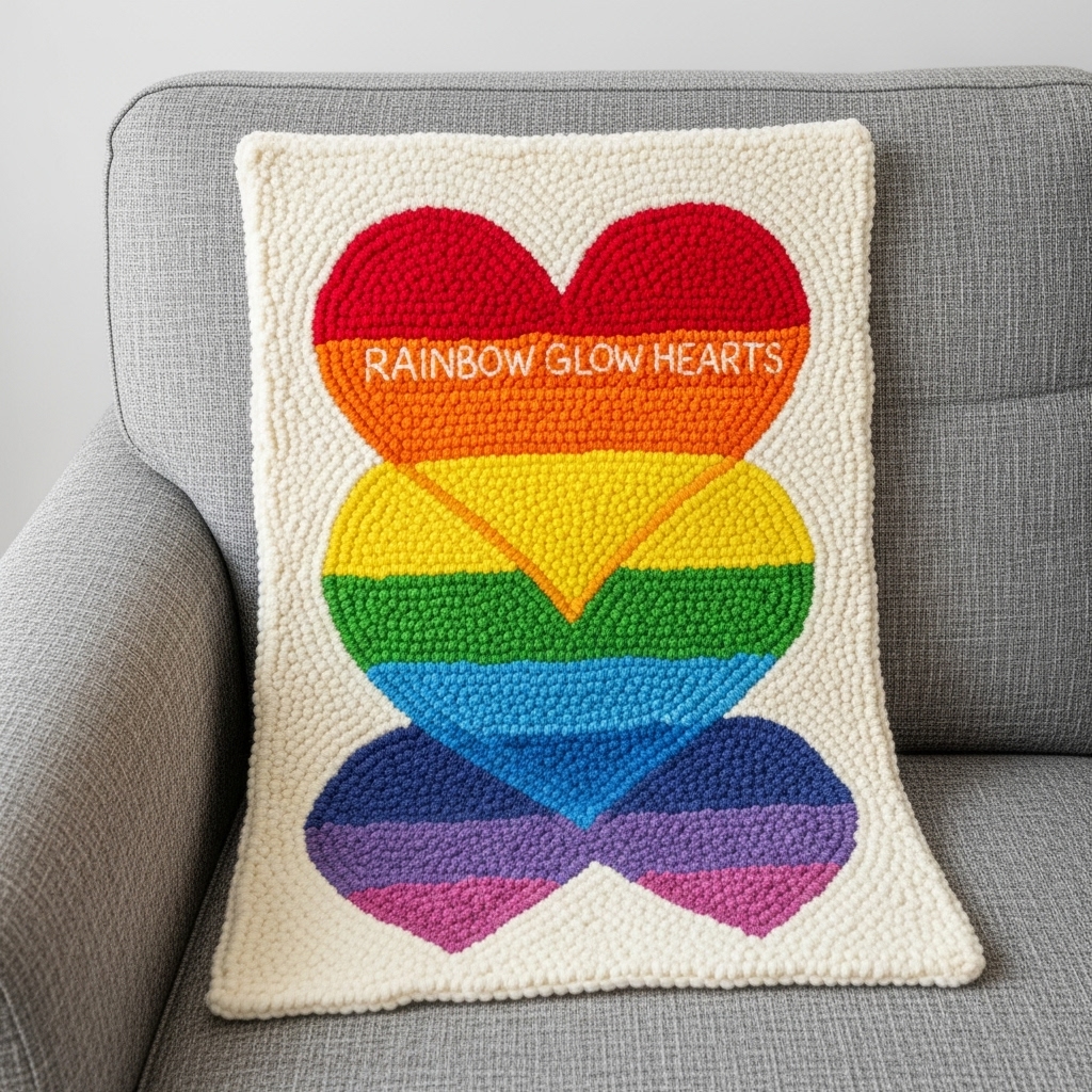 Rainbow Glow Hearts may be small, but it commands attention. Hand-hooked from resilient wool, its radiant hearts spill warmth, pride, and playful charm across an 8×12-inch canvas.