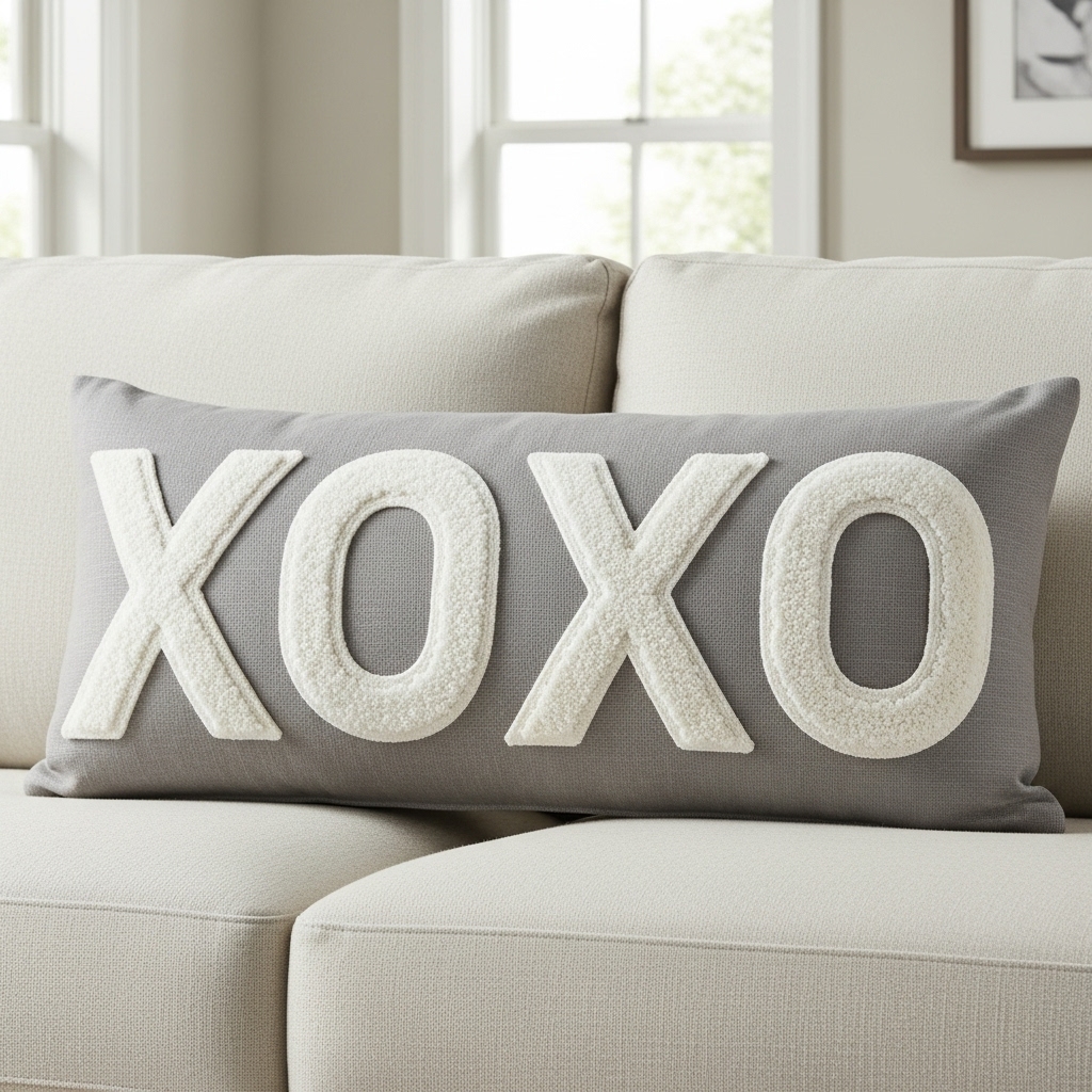 XOXO Hugs and Kisses delivers warmth with a modern, tactile twist. Oversized white X’s and O’s are appliquéd onto a soft gray backdrop, forming a 13×25-inch lumbar pillow that feels both playful and refined.