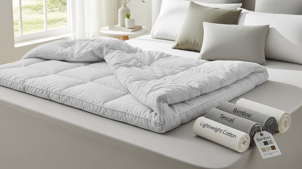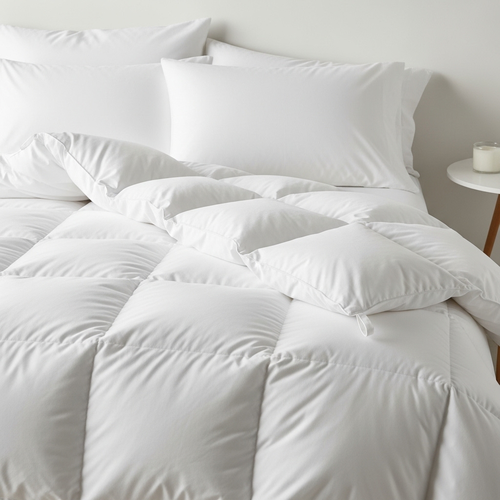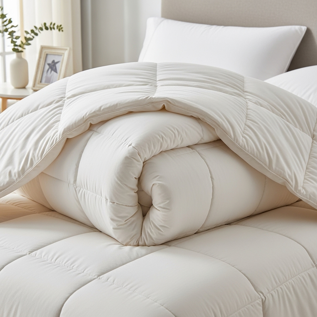 Opt for low fill power or down-alternatives like lyocell for breathability; check for baffle-box stitching to even fill. Pair with moisture-wicking covers and test in trials; wash per label to maintain cooling. Size up for drape; prioritize OEKO-TEX certs for safety.​