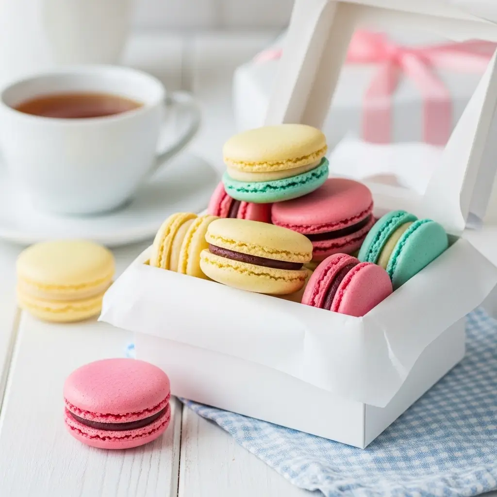 Almond flour, egg whites, powdered sugar, buttercreamWhip egg whites, fold in dry ingredients, pipe onto a mat, rest until a skin forms, and bake gently.They serve as an impressive, customizable, and highly sophisticated edible gift that pairs perfectly with afternoon tea.
