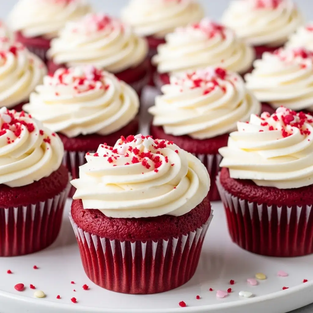 Flour, cocoa powder, buttermilk, red food coloring, cream cheeseWhisk batter, divide into lined tins, bake until springy, and pipe a tall swirl of frosting on top.Individual portions make them incredibly easy to serve, visually striking, and universally loved by almost every guest.
