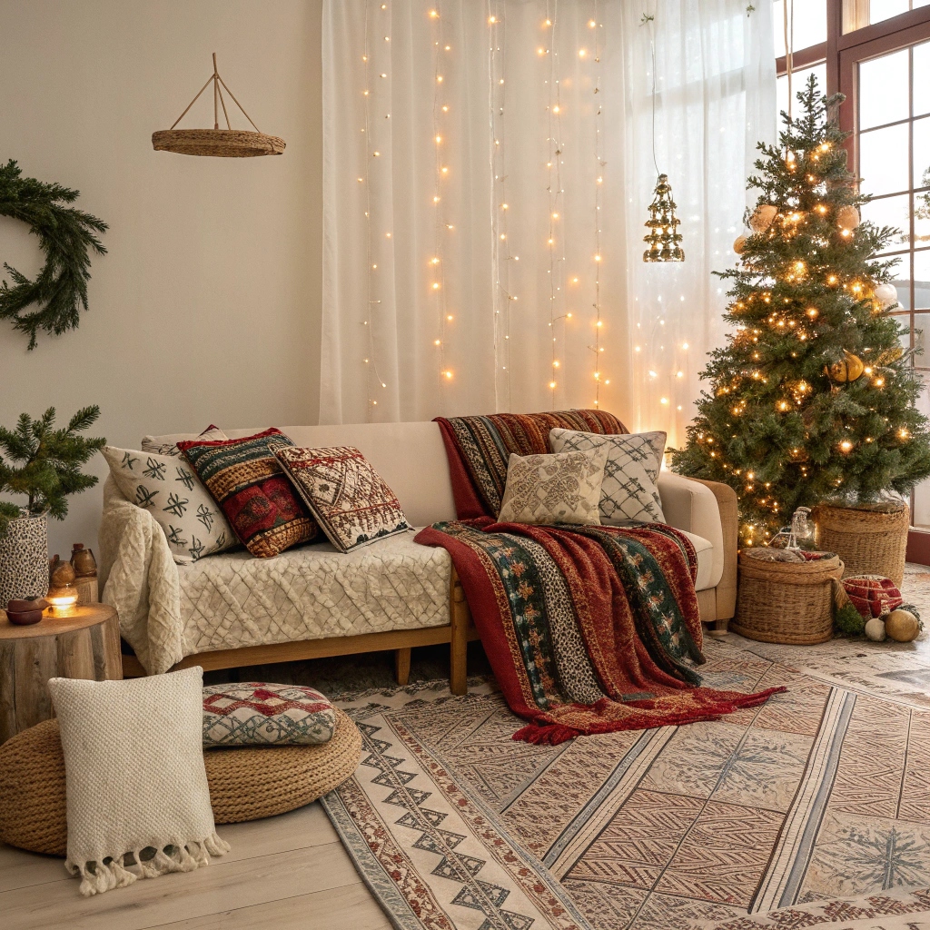 Boho loves layers, so don’t stop at the tree. Add patterned throws and pillows around your space with rich textures and bold prints. This boosts coziness and continuity in your decor vibe. Even your couch can get a Christmas makeover with a bit of Scandinavian weaving or neutral-toned macrame cushions.