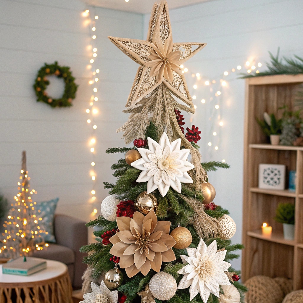 Last but definitely not least, say goodbye to the star or angel. Boho Christmas tree toppers go for unexpected materials like driftwood “stars,” oversized paper flowers, or lush macrame pieces. These give your tree a sculptural, artsy edge that perfectly caps off your unique setup. It’s like the cherry on top of your boho sundae.