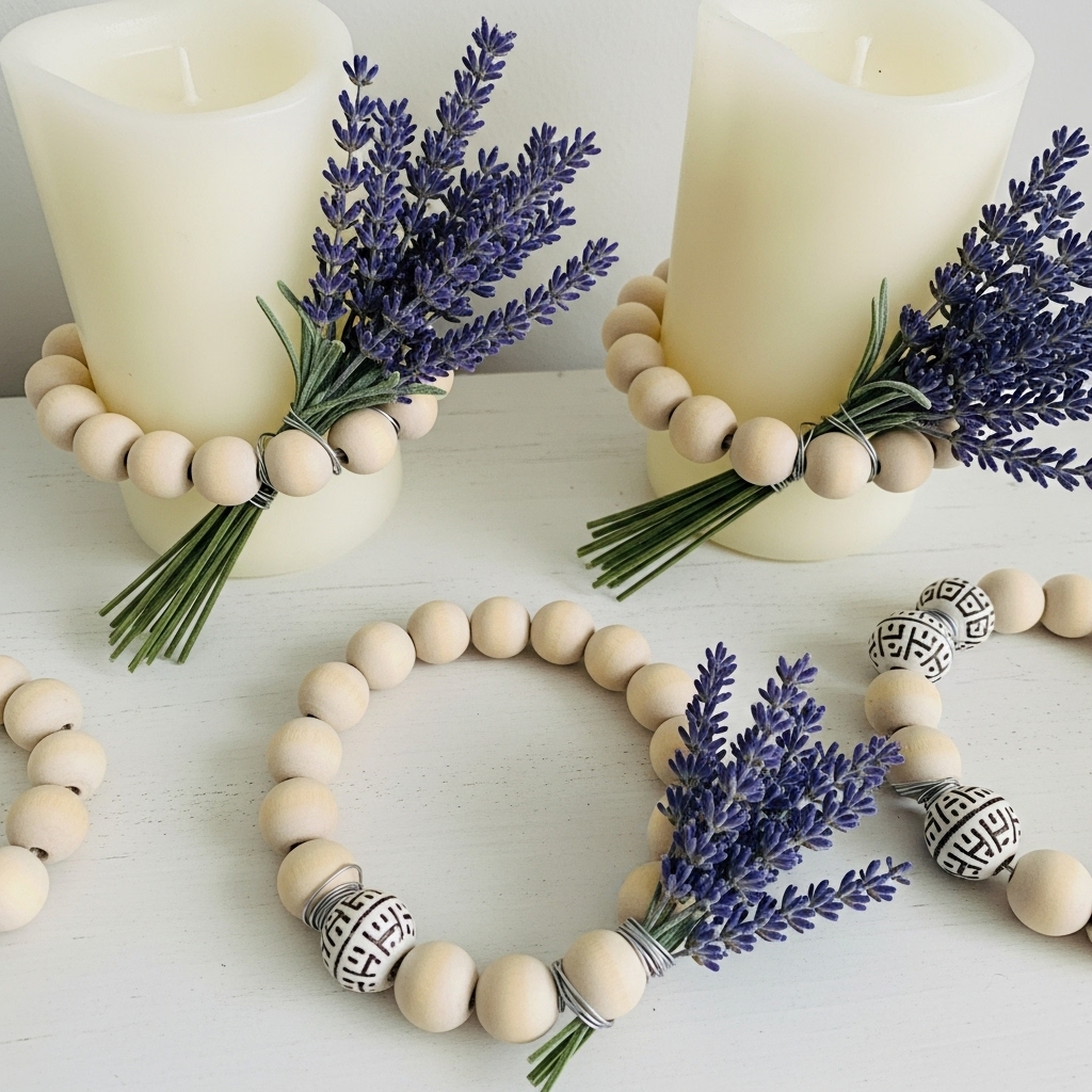 Let’s talk candle rings. You know those beautiful circular bead arrangements that fit snugly around candles? Make your own with wooden or ceramic beads strung on sturdy wire. Add a mini bouquet of lavender stems on one side for a pop of freshness. Place these around pillar candles on your mantel, and voilà instant ambiance.