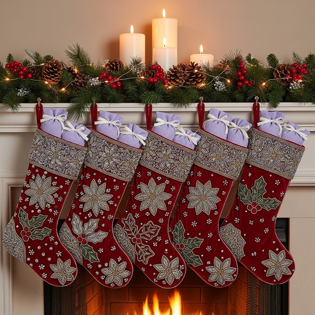 Keeping stockings on the mantel? Give them a chic upgrade by sewing or gluing bead designs onto them. Sneak in lavender sachets inside the stockings for a scent surprise when guests peek inside. It’s like the best of both worlds: holiday cheer and calming aromatherapy.