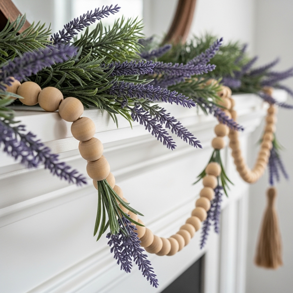 1. Classic Wood Beaded Garland Draped with Lavender Sprigs
