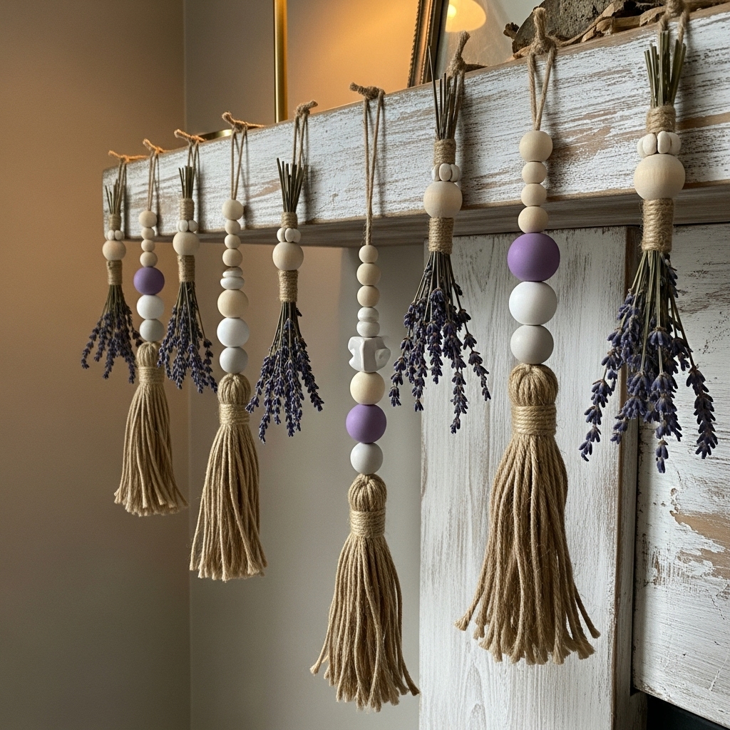 5. Lavender-Decorated Bead Tassels Hanging from the Mantel