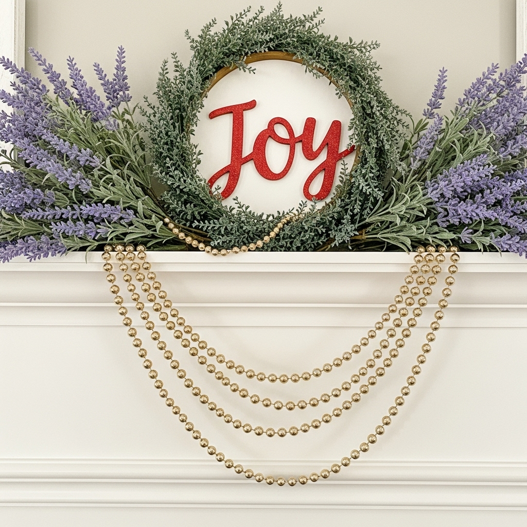 Maybe you love a statement piece? Center a festive sign (like “Joy” or “Merry”) on your mantel, then drape metallic bead garlands around it. Weave in fresh or faux lavender sprigs to balance the shimmer with a calming natural element. This combo screams “I put thought into this” without being overwhelming.