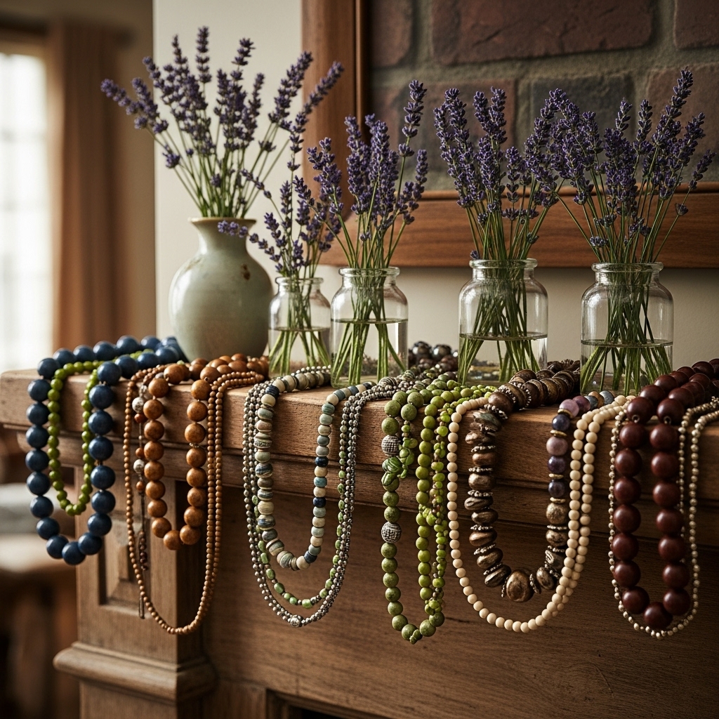 Here’s a quirky idea for those who like mixing decor styles: layer several bead necklaces of different sizes and textures loosely on the mantel. Place small vases or jars filled with lavender in-between the necklaces. This eclectic approach is artsy yet cozya great conversation starter for holiday guests.