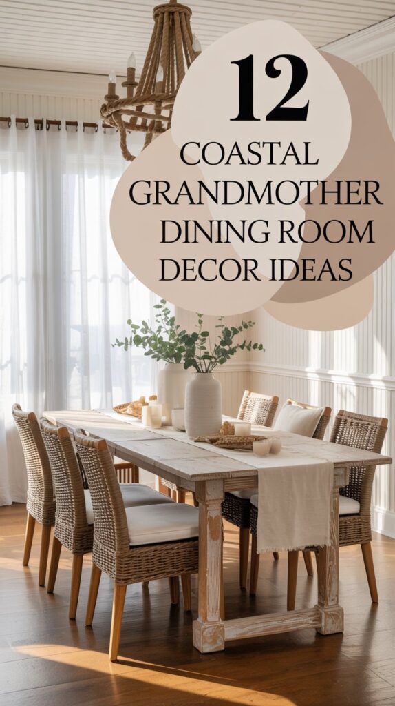 Window treatments in a coastal grandmother dining room should maximize natural light while adding softness. Choose floor-length curtains in sheer linen or lightweight cotton that can catch the breeze when the windows are open.