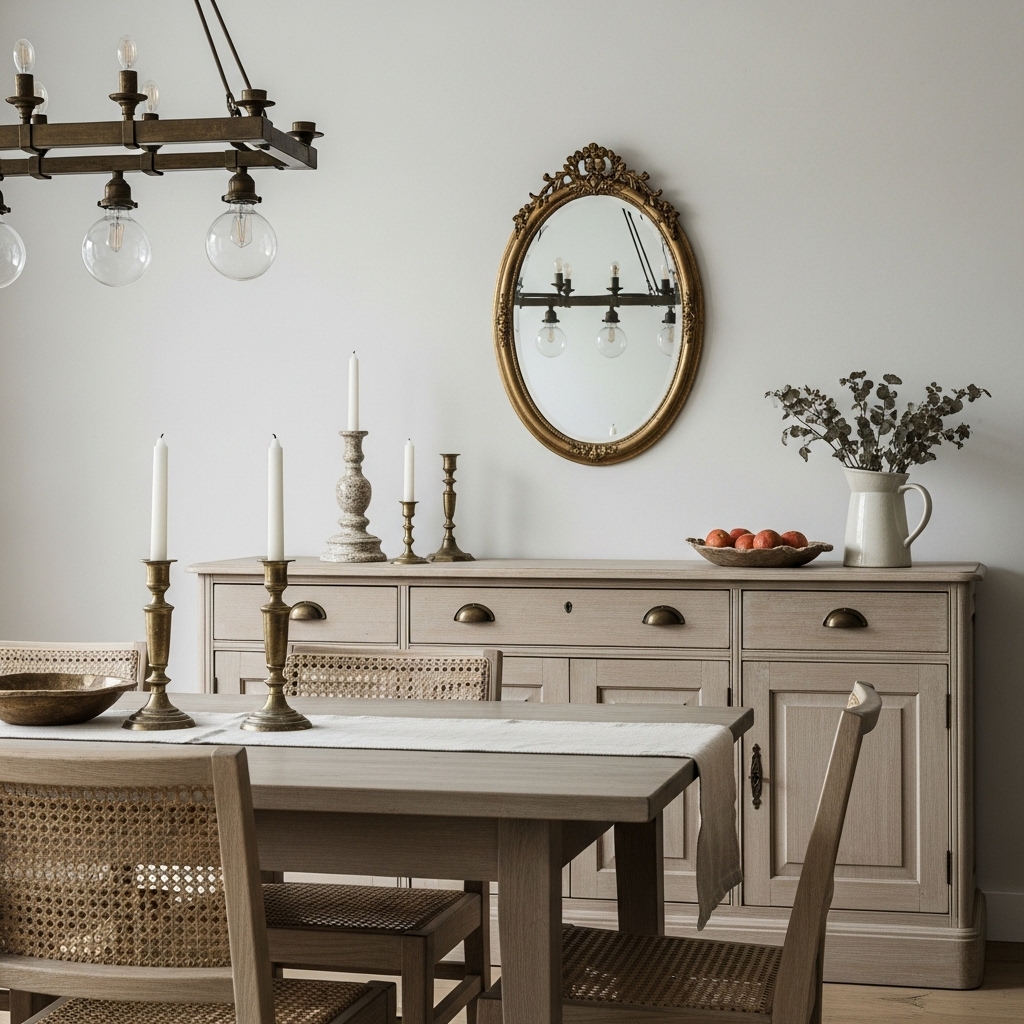 This could be in the form of vintage candlesticks on the table, drawer pulls on a sideboard, or the hardware on a light fixture.