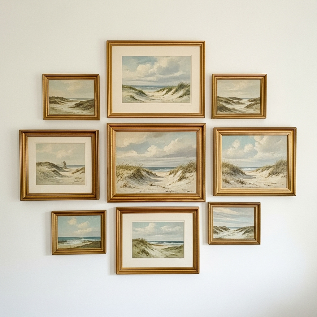 This art does not need to be expensive; the value lies in the mood it sets. A grouping of small landscapes draws guests in and acts as a quiet “window” to the coast, reinforcing the room’s serene narrative.