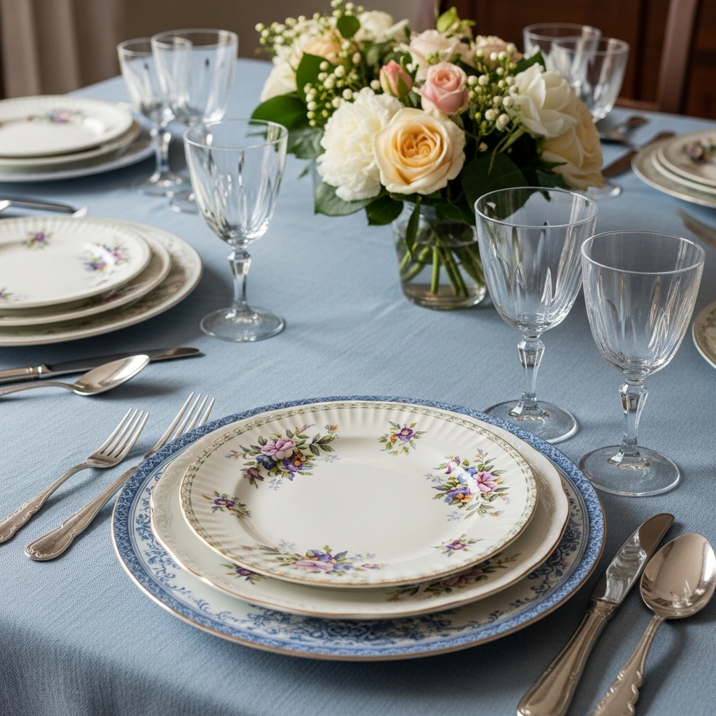 Scour antique shops for individual pieces that share a similar color story usually blues, creams, or soft greens. Layering a vintage floral salad plate over a simple white dinner plate creates a table setting that feels personal and storied.