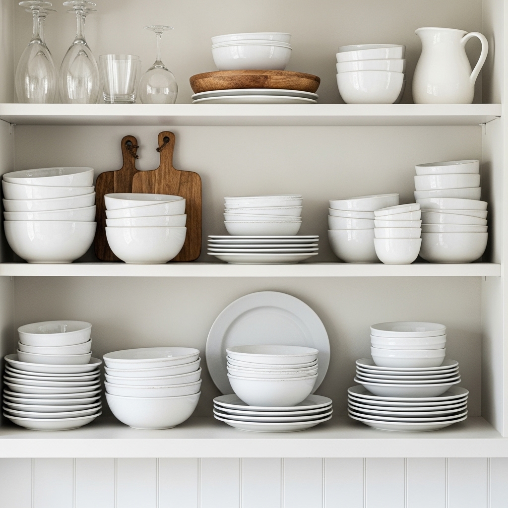 Stick to a palette of creamy whites, off-whites, and soft greys to maintain a clean, uncluttered visual rhythm. You can mix in clear glassware, a few wooden serving boards, or a ceramic pitcher to break up the uniformity. The result is a display that feels functional and hospitable, suggesting a kitchen that is always ready to feed loved ones.