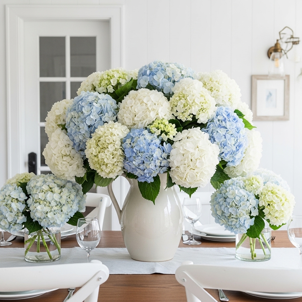 Fresh flowers are non-negotiable in this design style, and the hydrangea is the undisputed queen of the coastal garden.