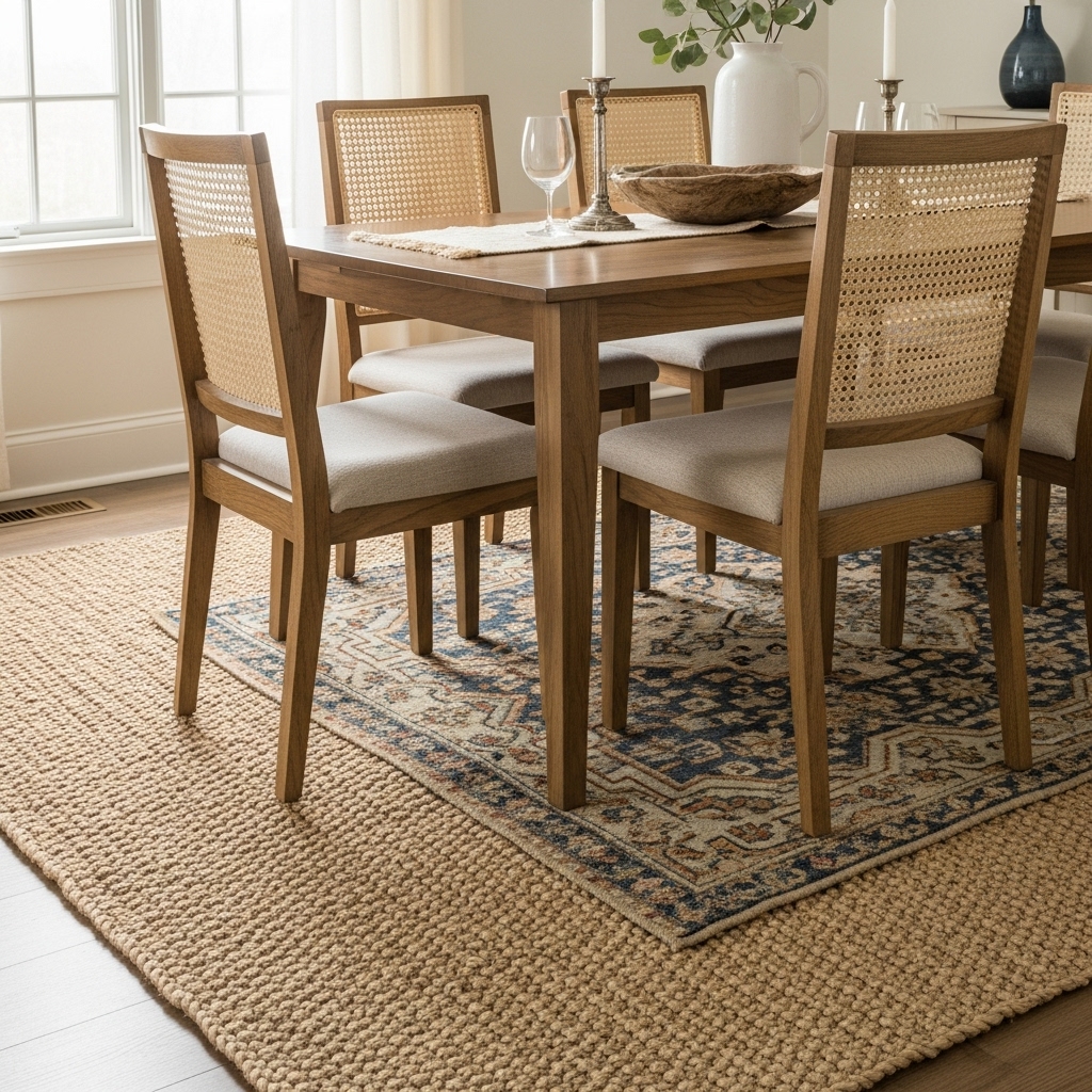 Grounding your dining room with a natural fiber rug brings an essential layer of warmth and texture to the space. Jute, sisal, or seagrass rugs offer a beautiful, earthy contrast to smoother finishes like glass or polished wood, preventing the room from feeling too stark or cold.