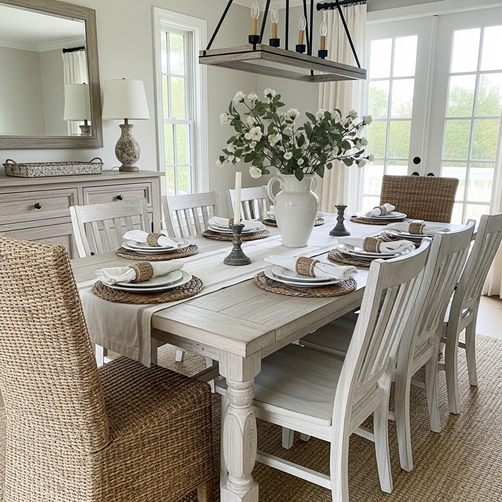 This lighter wood tone reflects natural light beautifully, keeping the room feeling airy and bright. It serves as the perfect neutral canvas for your linen runners and woven placemats, reinforcing the connection to nature that defines this aesthetic.
