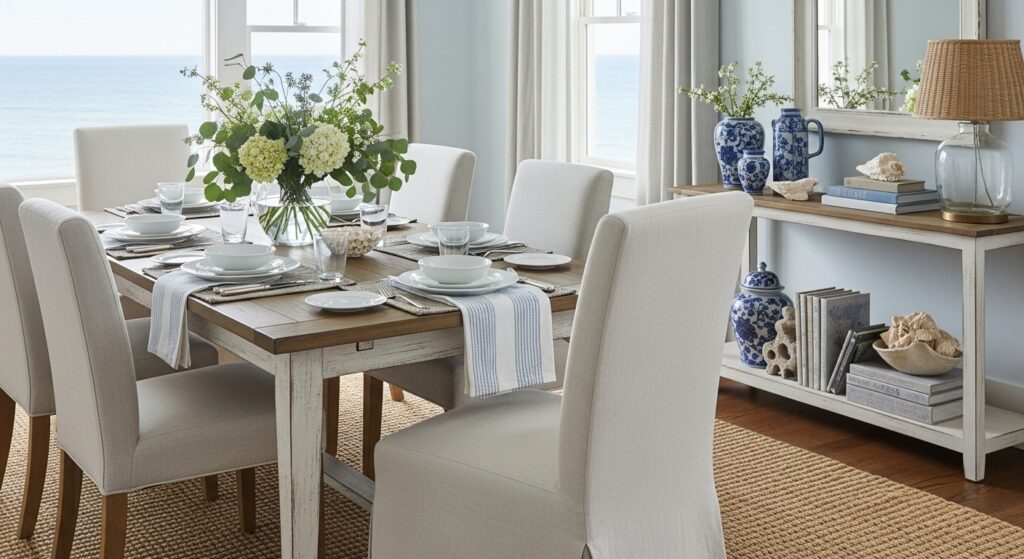 At the heart of the dining room should be a substantial table that feels sturdy and lived-in. Avoid high-gloss lacquers or dark, heavy stains in favor of whitewashed oak, pine, or bleached wood tones that mimic the look of driftwood.