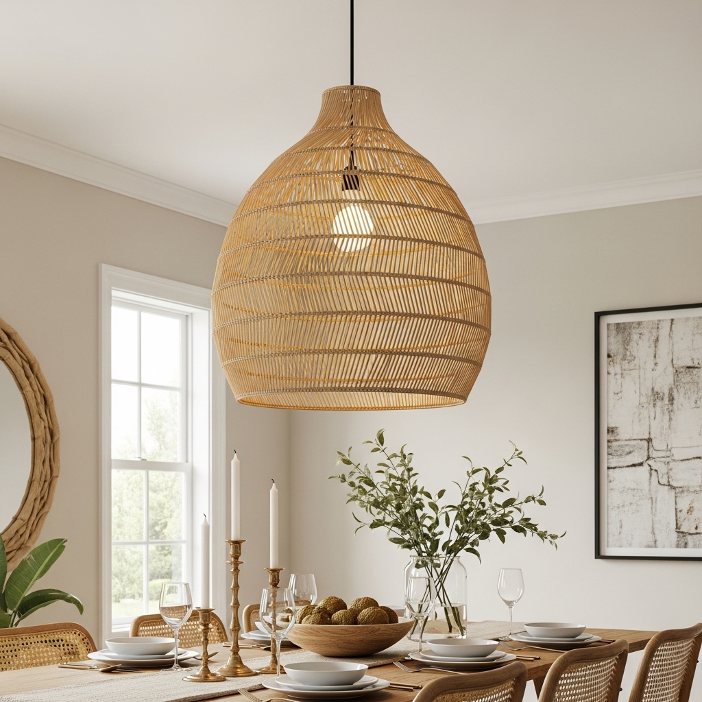 Lighting is the jewelry of the room, and for this style, a large woven pendant light is the perfect statement piece. Choose a fixture made from rattan, bamboo, or wicker to hang above your dining table.