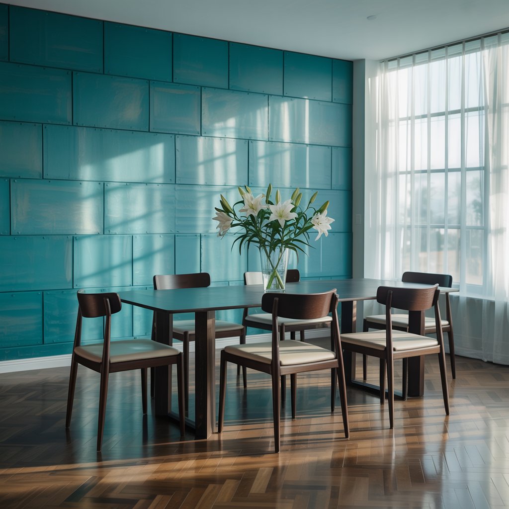Geometric patterns bring a bold, modern touch to any dining room, instantly refreshing the atmosphere. Strong lines and shapes on walls, rugs, or furniture create a striking visual that energizes the space.