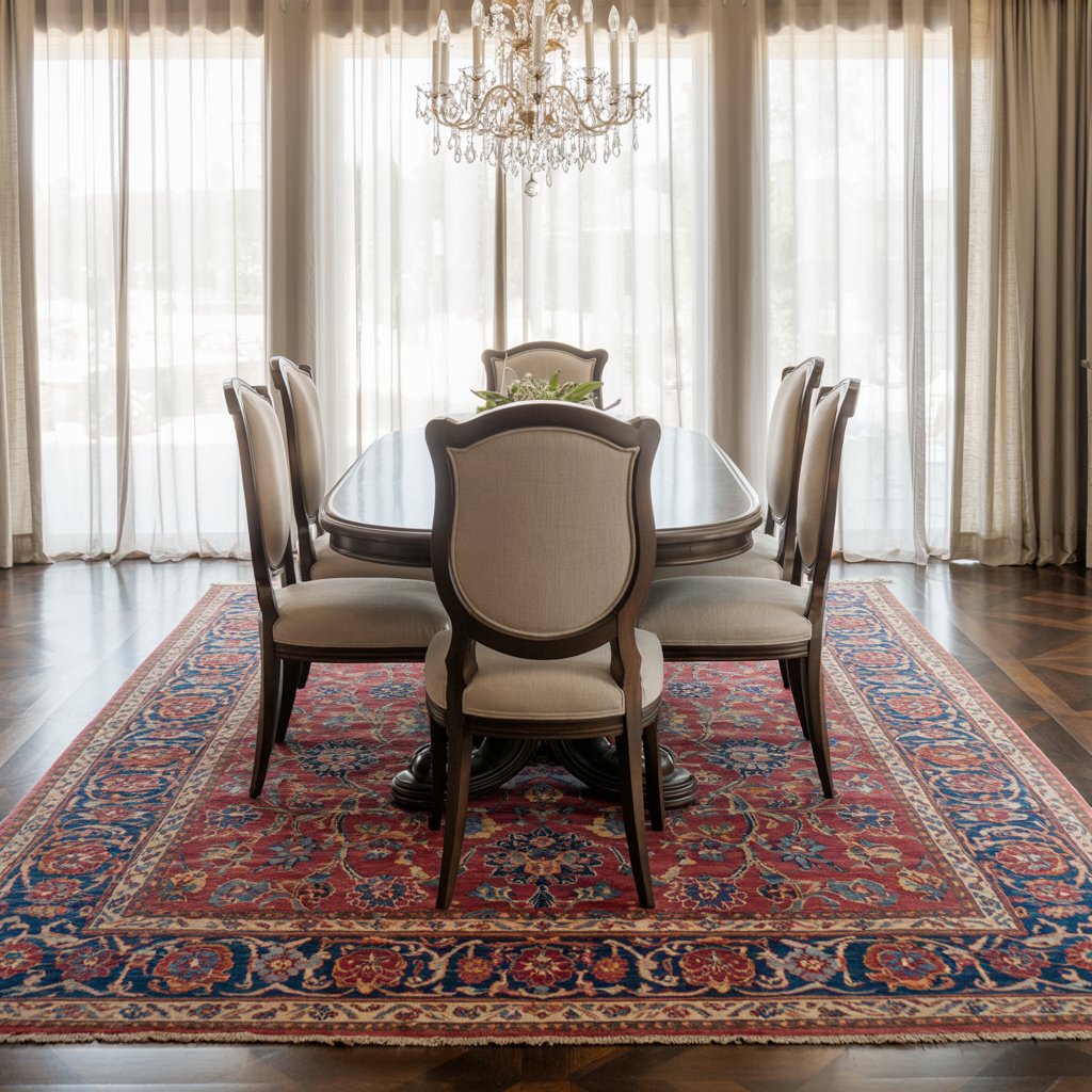Select a design that works harmoniously with your existing décor, but also consider proportion your rug should anchor the table and chairs without appearing too small. Acting as both centerpiece and boundary, a bold rug defines the dining area, giving it character and distinction.
