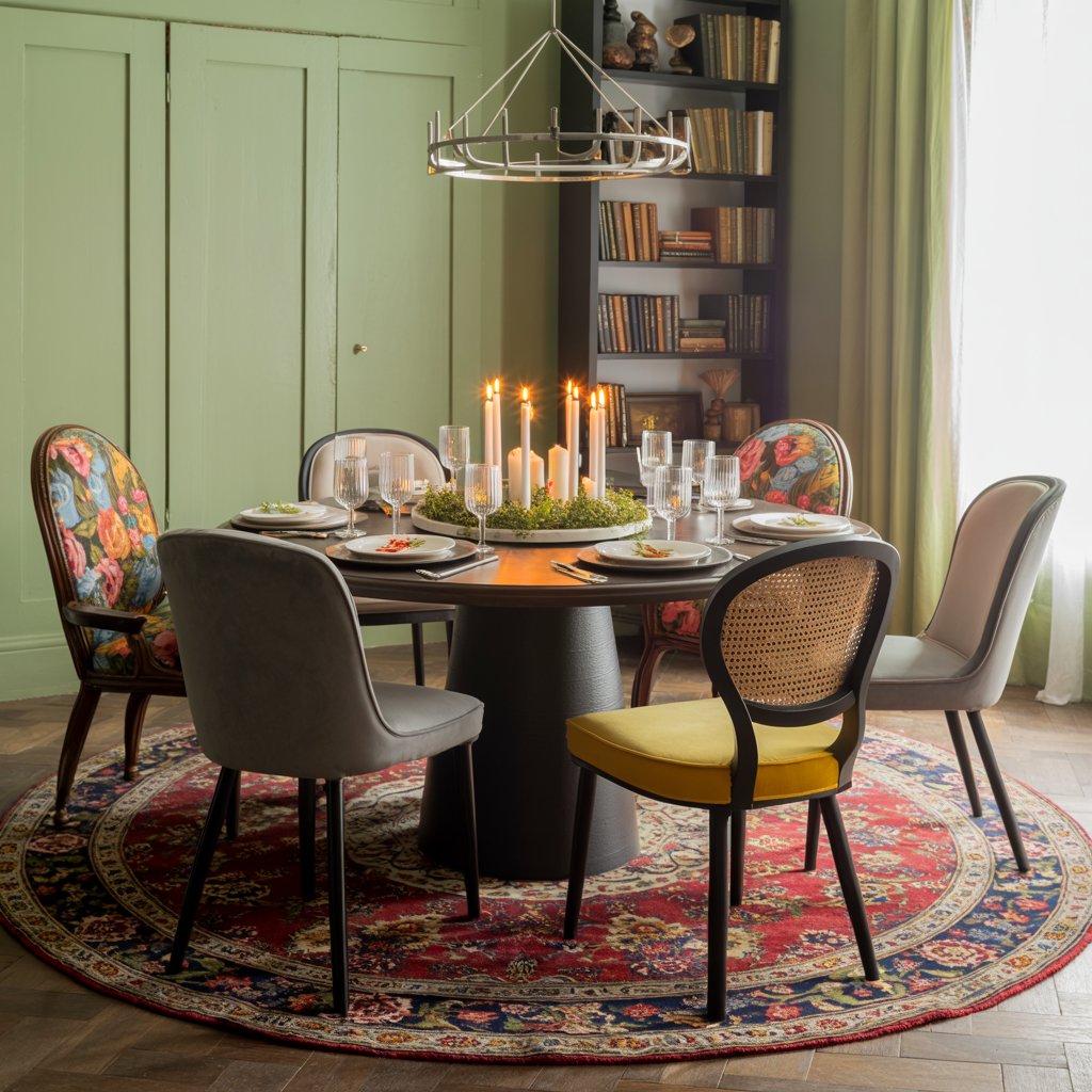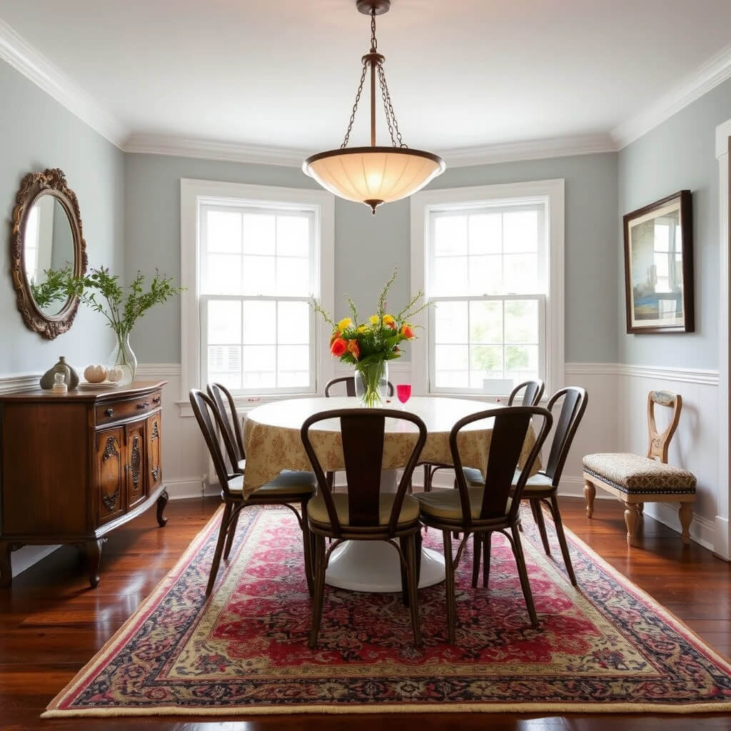 A patterned vintage rug or classic tablecloth can instantly shift the mood, evoking nostalgia and comfort. For a stylish balance, pair sleek modern furniture with aged accents. The thoughtful mix of past and present creates depth, personality, and a dining space that feels both welcoming and distinctive.