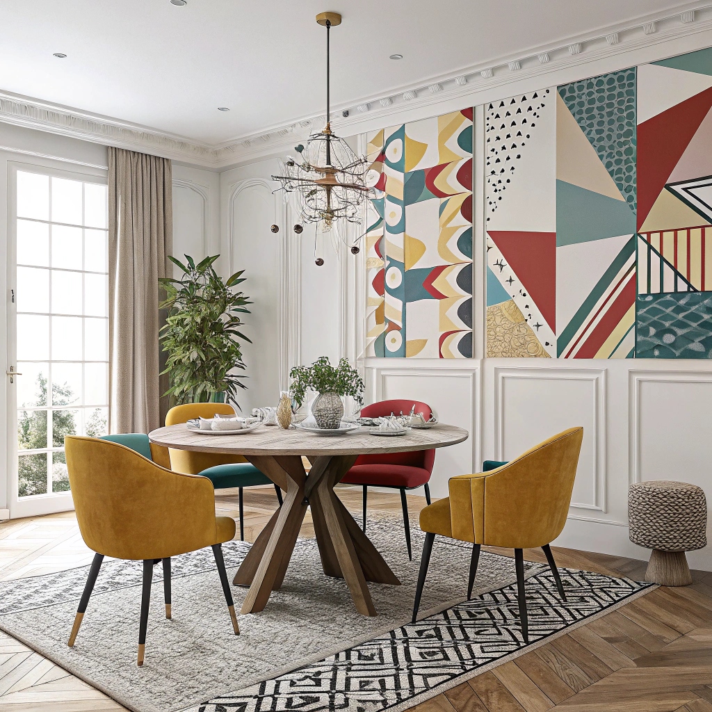 Layering different forms circles, triangles, and squares adds depth and balance, making the room feel both playful and stylish. Even subtle details, like patterned table linens or artwork, can achieve a polished effect. These thoughtful accents turn your dining area into a vibrant centerpiece while keeping the look sophisticated.