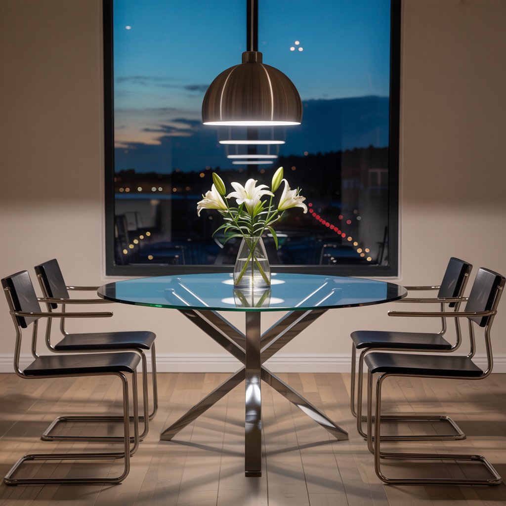 Glass and metal bring a crisp, contemporary edge to any dining room. A glass tabletop brightens the space, reflecting light and creating an airy, expansive feel, while metal frames or chairs lend strength and style with minimal upkeep.