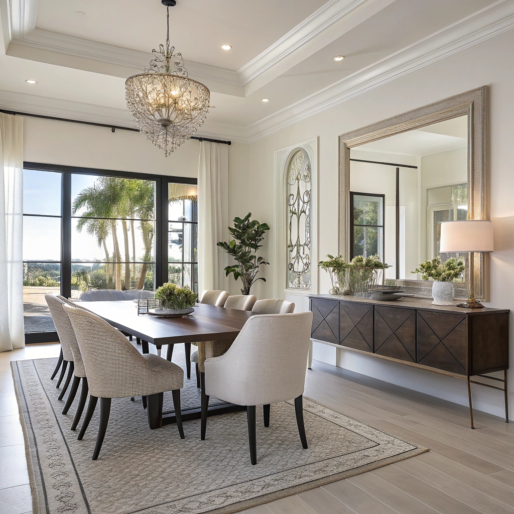 Mirrors are a clever way to expand the feel of a dining room, instantly making it appear brighter and more spacious. By reflecting both daylight and soft evening glow, they infuse the area with an airy, welcoming mood.