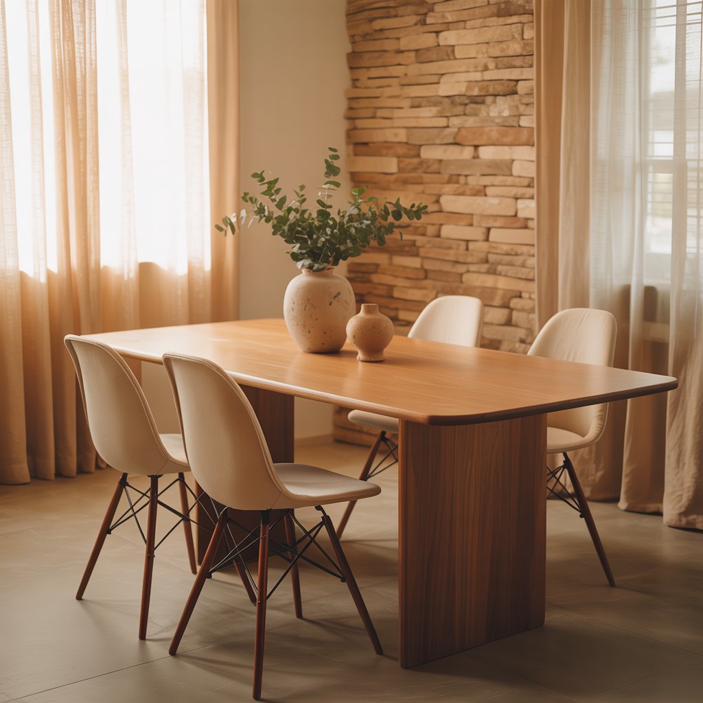 A solid wooden table paired with stone accents whether a textured wall or sleek countertop strikes a balance between rustic charm and modern elegance. To deepen the natural feel, layer in greenery or organic accessories like stone vases or wooden bowls, creating a lively, welcoming atmosphere for gatherings.