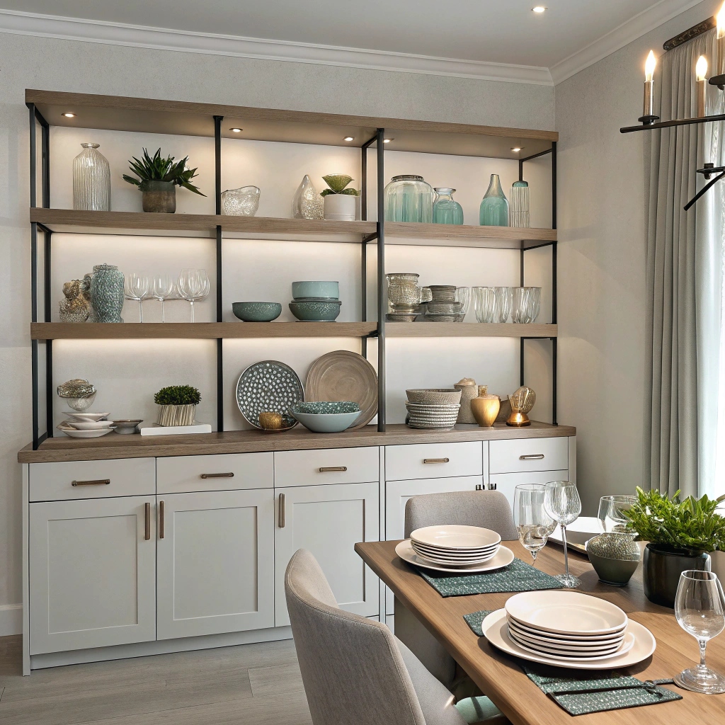 Using open shelves allows you to easily access your everyday dishes while also displaying beautiful pieces that reflect your personal style. This approach keeps your dining room organized and visually appealing without needing bulky cabinets.
