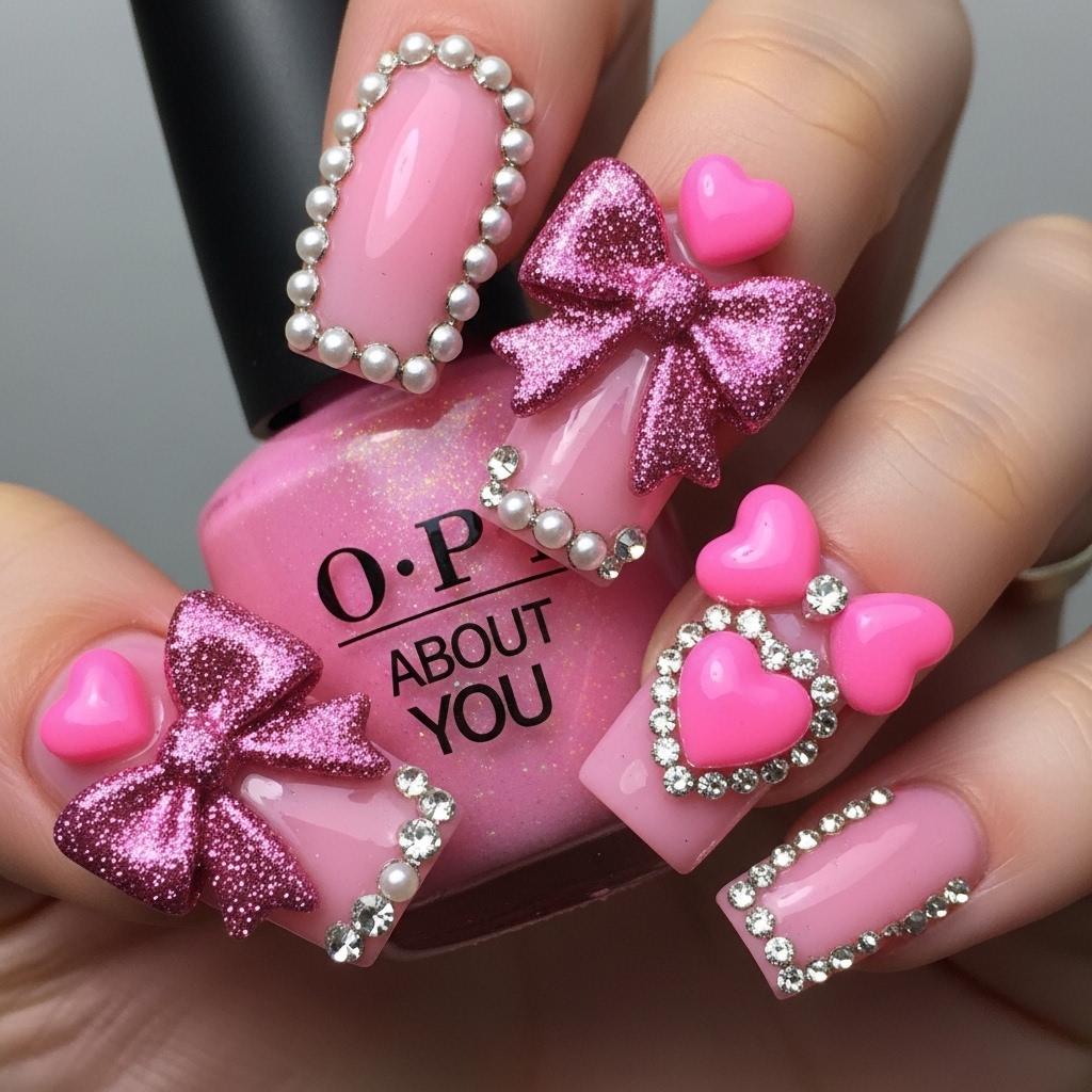 Barbiecore pink bows steal the spotlight, built on a bubblegum OPI Mod About You base that glows with soft sparkle. Glitter-drenched bows, dimensional hearts, and rhinestone borders layer in playful drama. Delicate pearls trace the edges, balancing sweetness with refined coquette charm.
