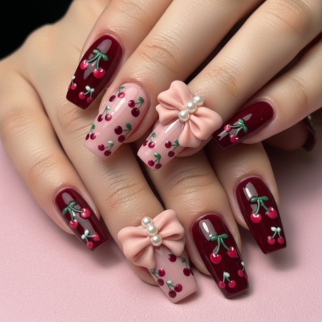Cherry Bow Romance leans into drama without losing its soft heart. A deep burgundy base sets the mood, while dusty pink accents soften the intensity. Delicate cherry motifs scatter across the nails, playful yet refined.