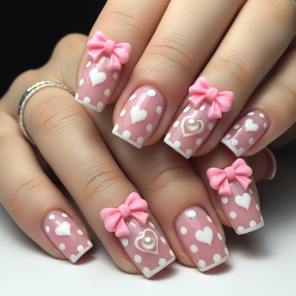 Soft milky pink sets the tone, layered with crisp white polka dots and delicate heart motifs that feel light, sweet, and effortlessly charming. Raised pink bows add texture and personality, while tiny pearls nestled at the heart centers introduce a subtle touch of elegance.