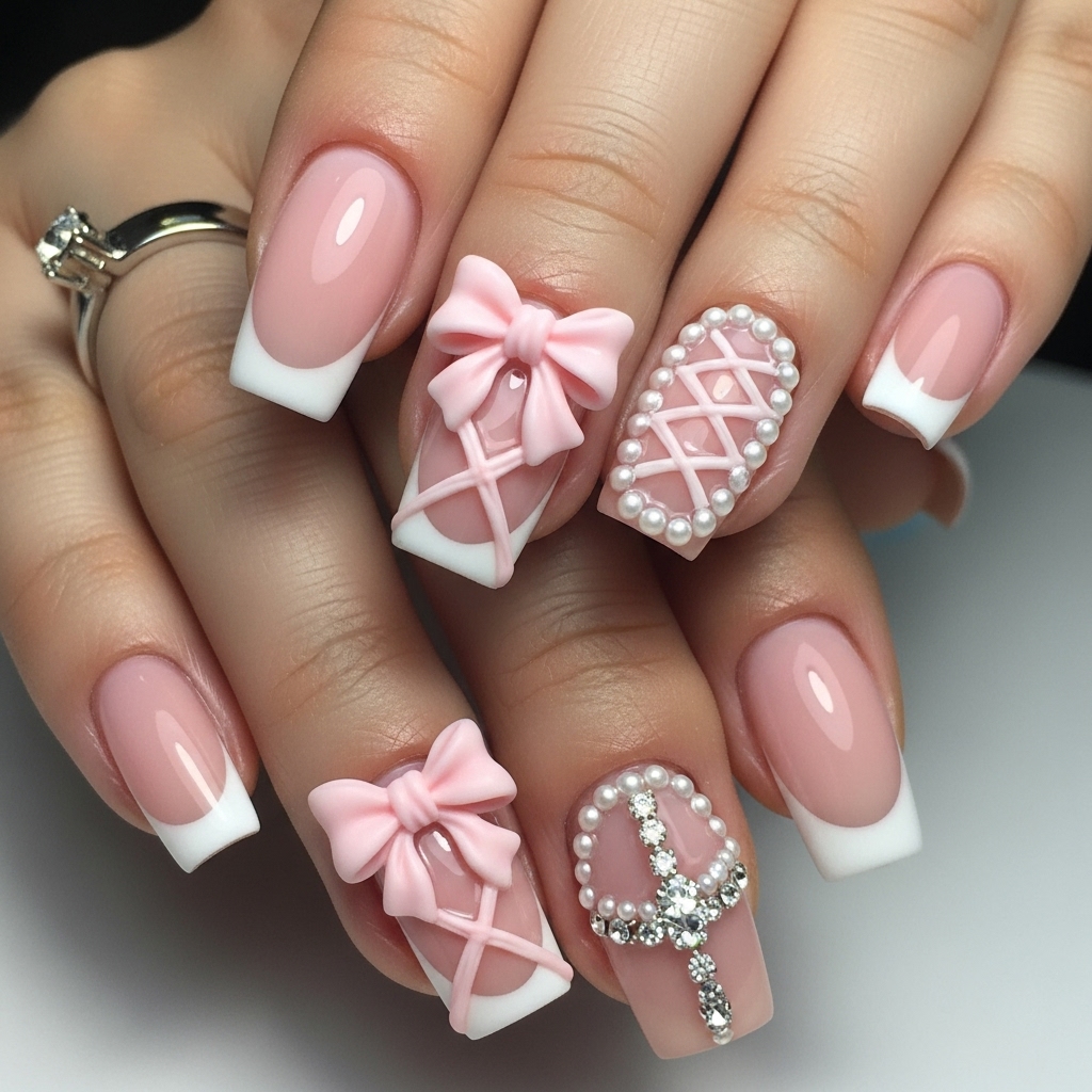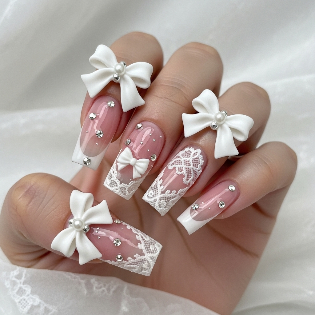 Sculpted 3D bows crisscross the nails, adding couture-inspired drama. One accent nail dazzles with crystal detailing reminiscent of corset lacing, framed by subtle pearl accents.