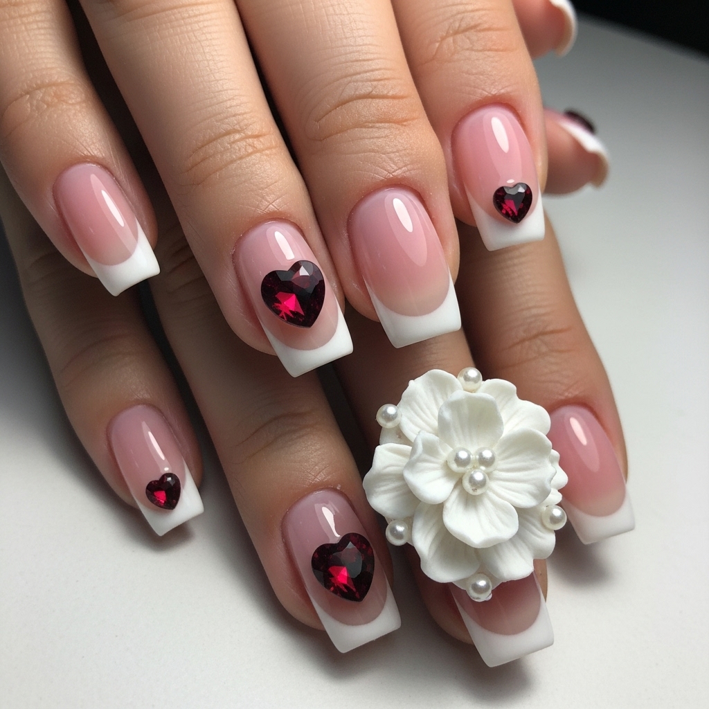 Blushing pink melts into clean white tips, crafted with Young Nails Mission Control Pink and elevated by deep burgundy crystal hearts. The look balances softness and structure.