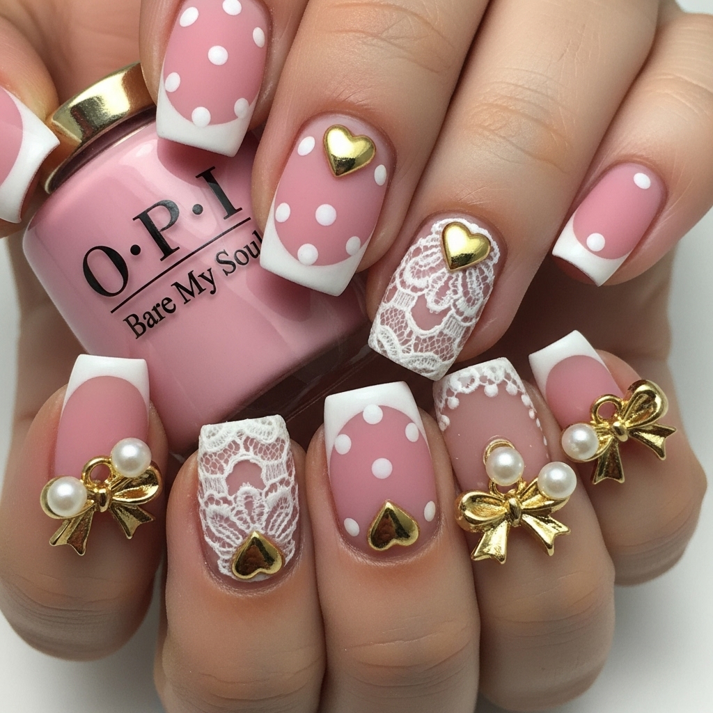 Gold Hearts and Lace comes alive on a matte pink OPI Bare My Soul base, delicate yet confident. White polka dots dance across the surface, meeting lace-inspired French tips with a whisper of vintage charm.