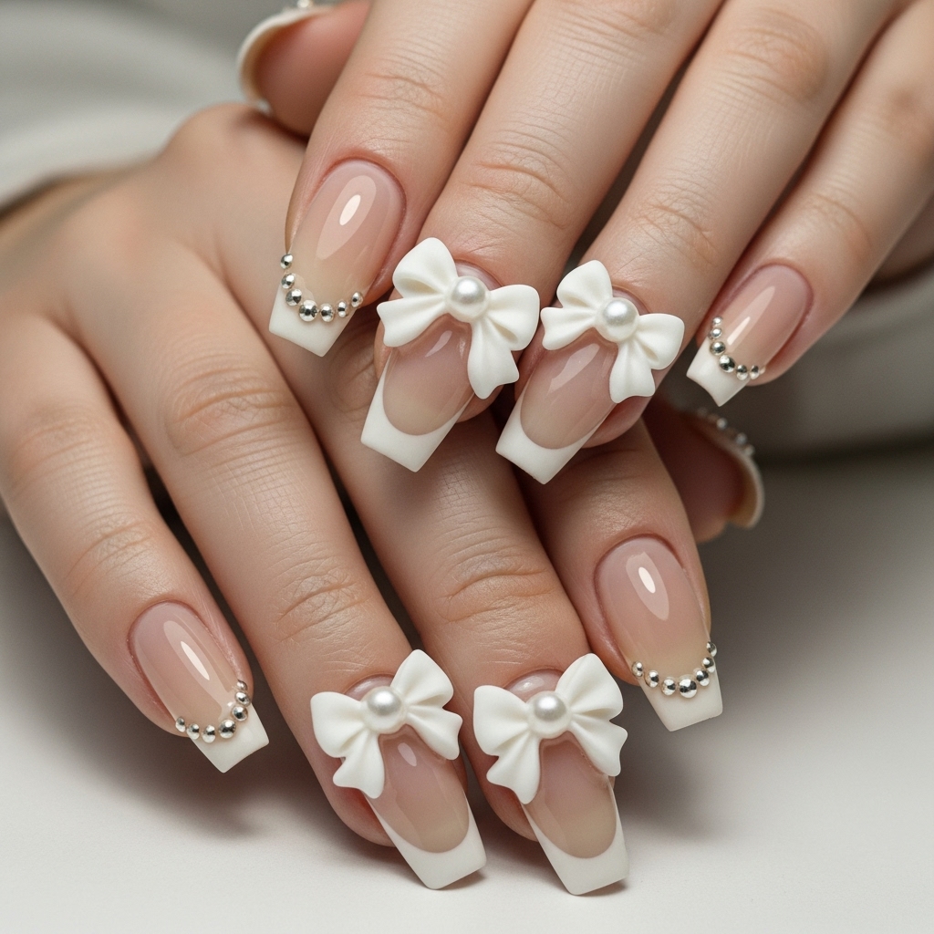 Soft beige neutrals set a calm, refined foundation, allowing delicate white 3D bows to take center stage. Tiny rhinestones placed along the tips catch light quietly, never overpowering the look. At each bow’s base, pearls add a gentle glow that feels romantic without excess.