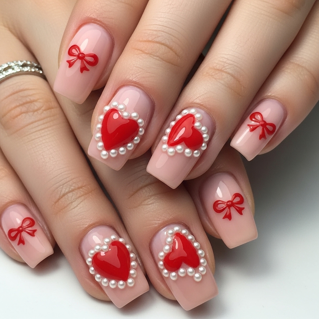 Tiny pearls rest near the cuticle, offering quiet luxury that flickers under candlelight. The contrast feels playful yet confident, balancing sweetness and drama. Perfect for bold romantics who love charm, texture, and statement details. Ideal for date nights, celebrations, and fashion-forward Valentine moments.