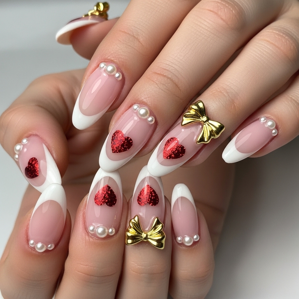 Almond-shaped nails begin with a milky pink jelly base, reminiscent of OPI Bubble Bath, finished with a glass-like shine. Soft white tips gently frame glittering red hearts and metallic gold 3D bows, channeling balletcore romance with flair.